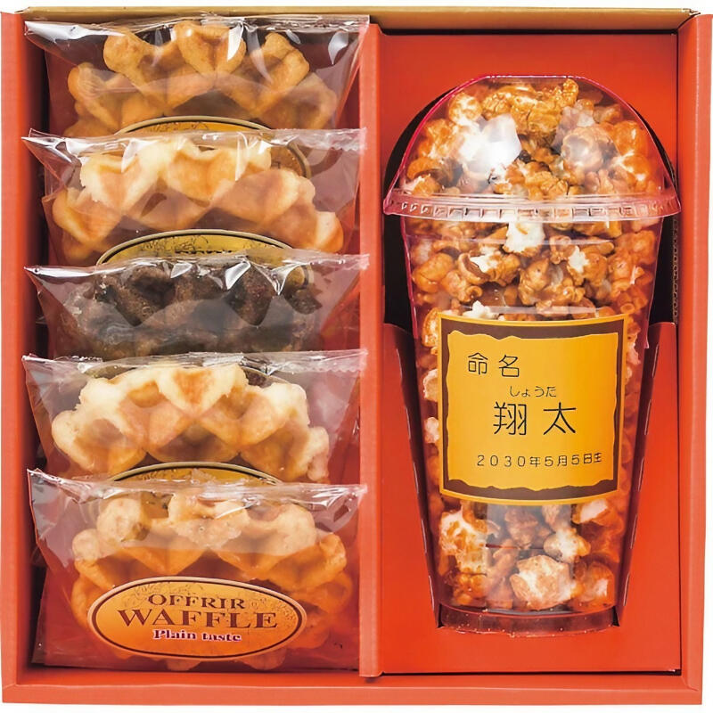 塩キャラメルポップコーン、ベルギーワッフル(プレーン)×2、ベルギーワッフル(メープル)×2、ベルギーワッフル(チョコ)