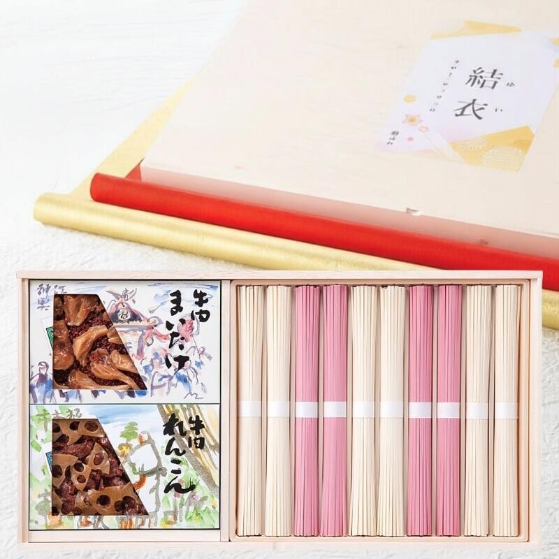 「池利」の梅を練りこんだ華やかな紅白うどんと、「浅草今半」の牛肉佃煮のセットです。