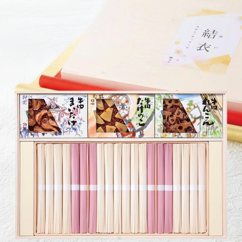 「池利」の梅を練りこんだ華やかな紅白うどんと、「浅草今半」の牛肉佃煮のセットです。