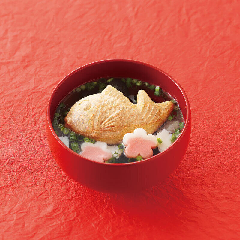 味も形も喜ばしい、縁起づくしの逸品です。可愛らしい鯛型の最中に梅形の麩が華やかな、本格和風だしのお吸物です。