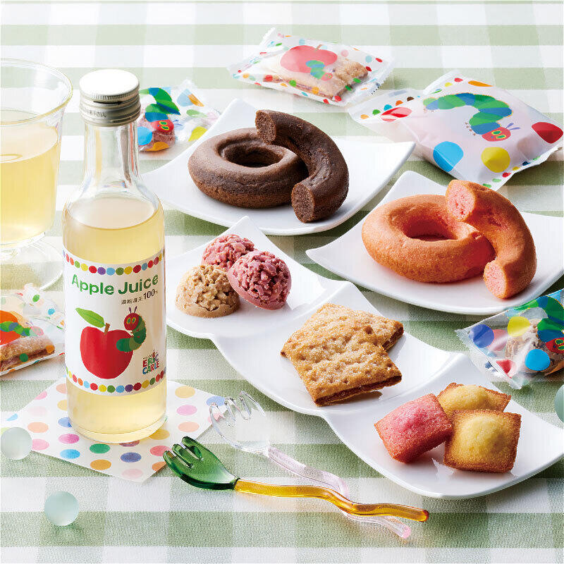 【商品内容】アップルジュース180ml×2、スクエアパイ(アップル)×3、焼きドーナツ(チョコ・ストロベリー)、チョコクランチ(ホワイト・ストロベリー)各2、プチフィナンシェ3個入(ストロベリー・アップル)