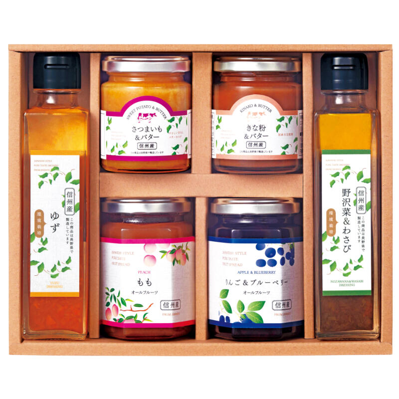 【商品内容】(ももスプレッド・りんご&ブルーベリースプレッド)各140g、(さつまいも&バターペースト・きな粉&バターペースト)各110g、(ゆずドレッシング・野沢菜&わさびドレッシング)各150ml