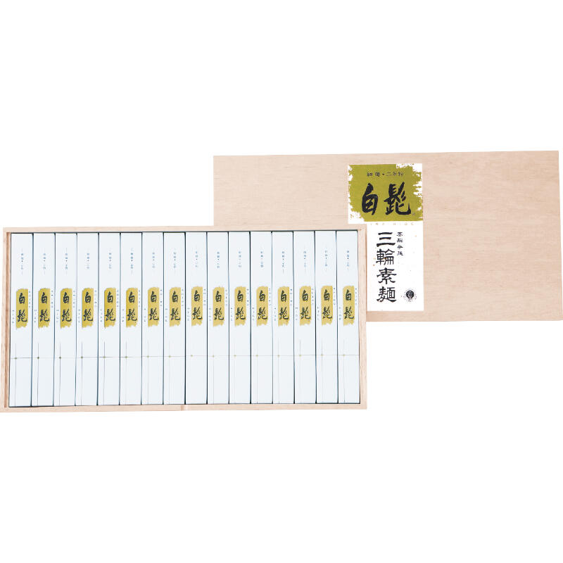匠の技と選び抜いた小麦粉を白髭専用にブレンドする事で一口目からの美味しさにこだわりました。早ゆで50秒の白髭は細くて滑らかな口当たりが特徴の高級三輪素麺です。