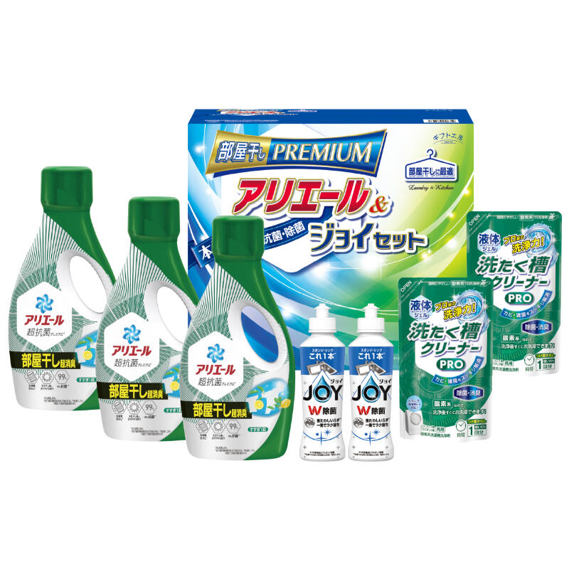 優れた本格消臭で部屋干しに最適なアリエールとダブル除菌の食器洗剤ジョイが入ったランドリー&キッチンセットです。