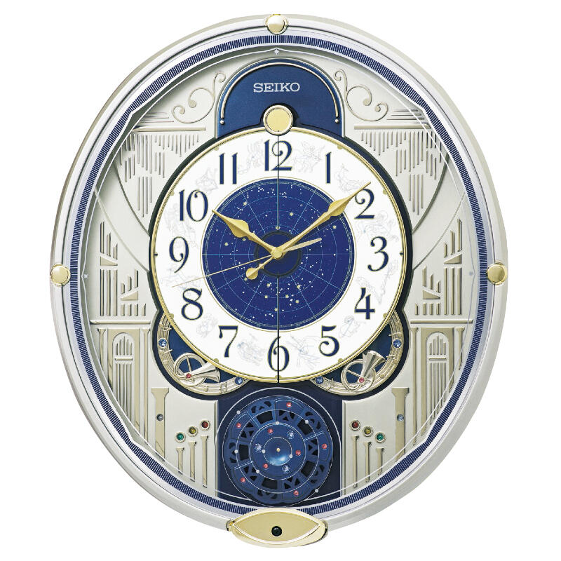 ●電波修正機能 ●正時パフォーマンス&6曲メロディ ●光センサーによる自動鳴止め ●音量調節 ●報時モニター機能 ●LEDライト点滅(6ヶ所) ●一方向回転飾り ●おやすみ秒針(光センサーによる自動秒針停止機能)●石膏ボード用掛金具つき ●スイープ秒針