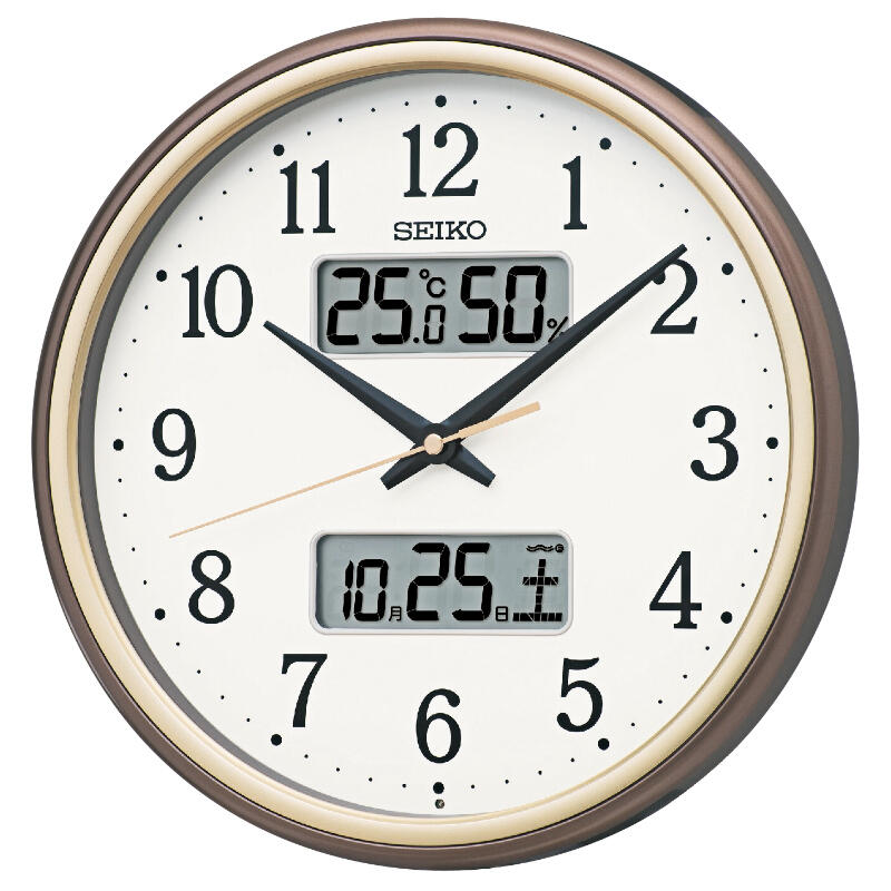 使いやすいサイズのカレンダー、温度・湿度表示つき電波掛時計。