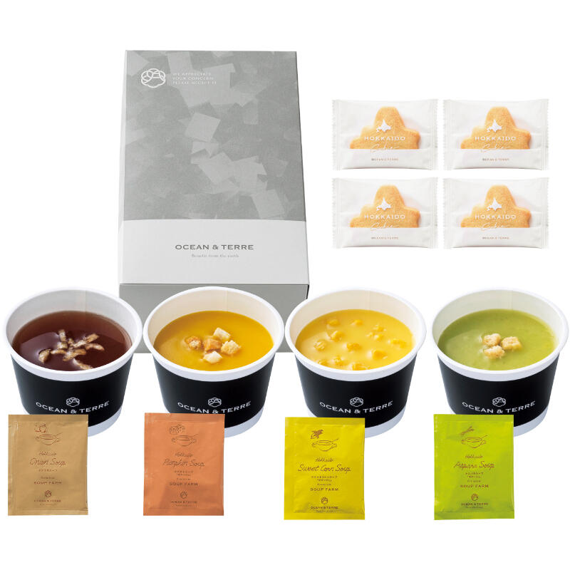 【商品内容】北海道産(玉ねぎスープ・かぼちゃスープ・スイートコーンスープ・アスパラスープ)・CUP×4・北海道型クッキー×4
