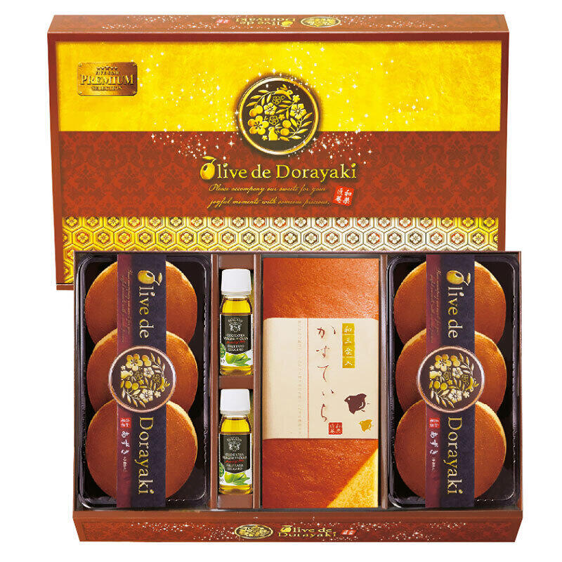 和菓匠菴自慢のどら焼きと和三盆糖入りかすてぃら、イタリア産エキストラヴァージンオリーブオイルの特別な詰合せ。