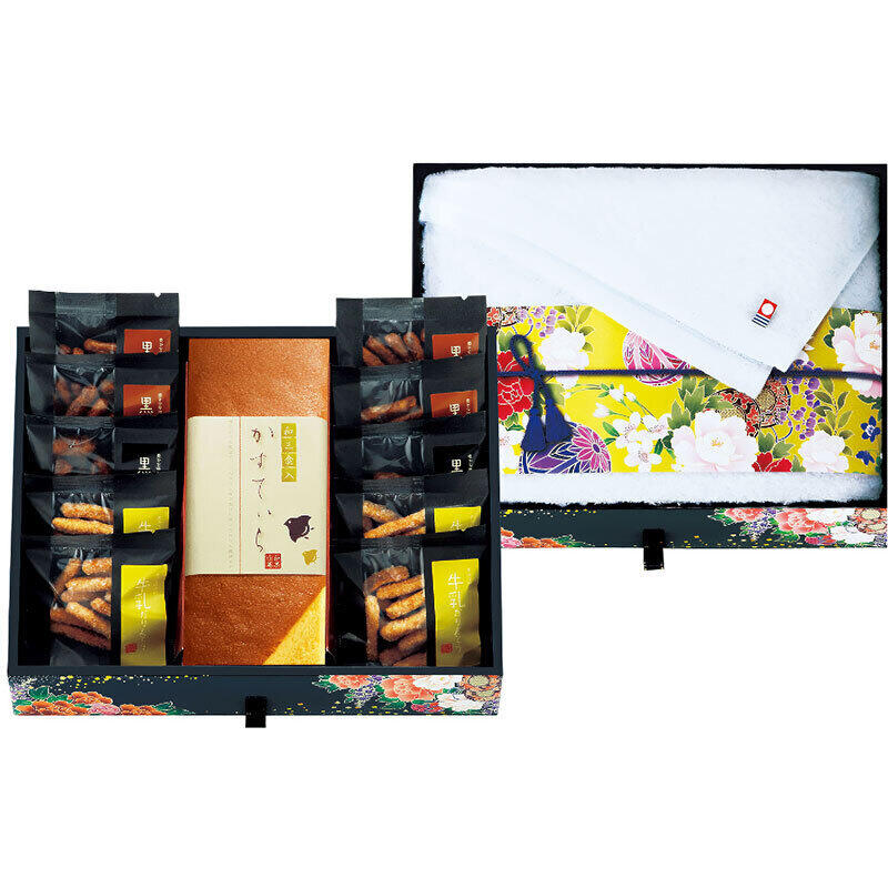 【商品内容】和三盆糖入かすてぃら(プレーン)1本・かりんとう(黒糖×4・黒胡麻×2・牛乳×4)各15g・フェイスタオル340×750mm