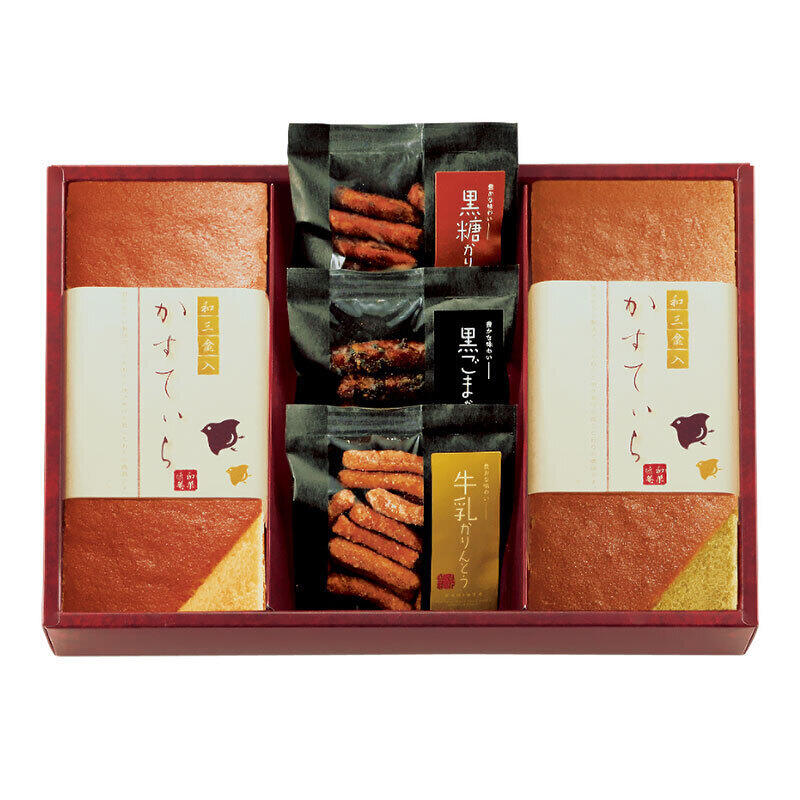 【商品内容】和三盆糖入かすてぃら(プレーン・抹茶)各1本・かりんとう(黒糖・黒胡麻・牛乳)各15g