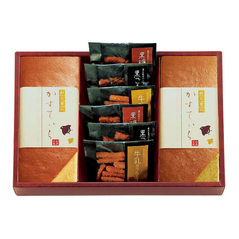 【商品内容】和三盆糖入かすてぃら(プレーン・抹茶)各1本・かりんとう(黒糖・黒胡麻・牛乳)15g×各2