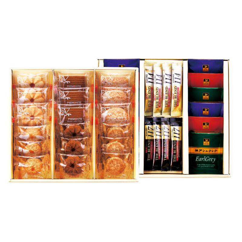 【商品内容】クッキー(フラワー・シナモン・サクサク・レモン・ソフト・オレンジ)各3・ティーバッグ(ダージリン・セイロン・アールグレイ)各4・UCCザ・ブレンドスティックコーヒー(114・117)各4
