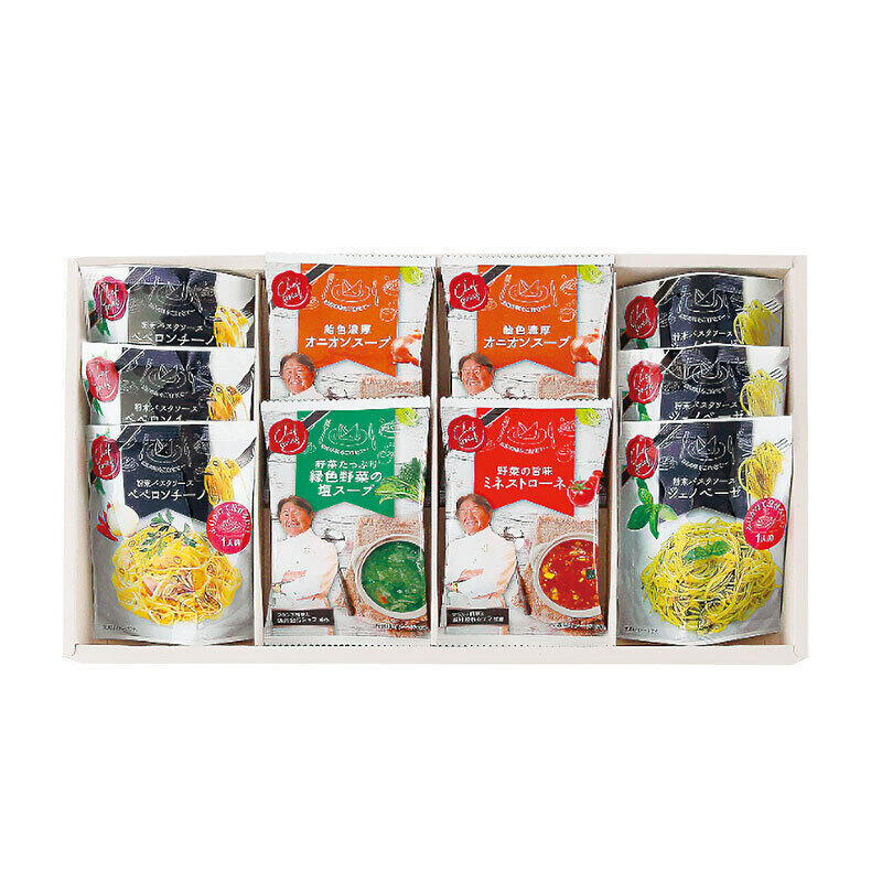 【商品内容】オニオンスープ×2・ミネストローネ・緑色野菜の塩スープ・粉末パスタソース(ジェノベーゼ・ペペロンチーノ)各3