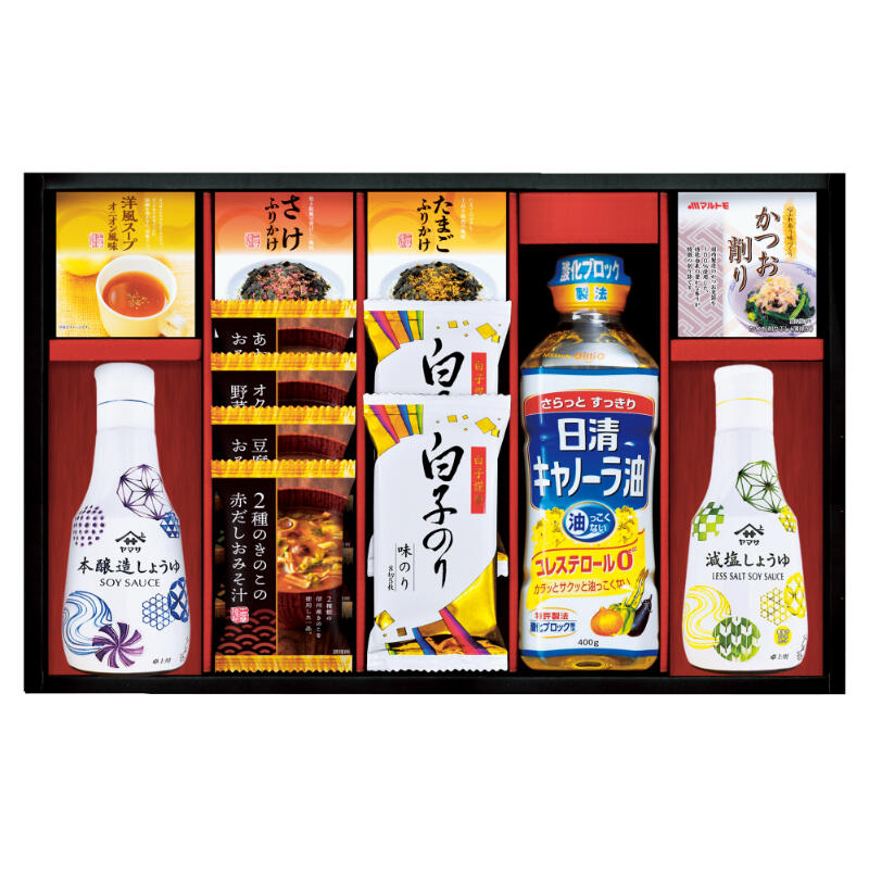 【商品内容】ヤマサ(鮮度しょうゆ・鮮度減塩しょうゆ)各200ml・日清キャノーラ油400g・おみそ汁(とうふと油揚げ・2種のきのこの赤だし・あおさとわかめ)・オクラ入ねばねば野菜スープ・丸美屋ふりかけ(たまご・さけ)2.5g×各3・丸美屋洋風スープオニオン風味(2.5g×3)・マルトモかつおパック(0.7g×3)・白子のり味のり(8切5枚)×2