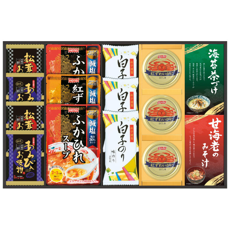【商品内容】ふかひれスープ160g×2・紅ずわいがにスープ160g・紅ずわいがにほぐし身55g×3・(あわび入お吸い物・松茸入りお吸い物)各2・甘海老みそ汁(7.5g×2袋)・丸美屋のり茶漬け(6g×4袋)・白子のり(8切5枚)×3