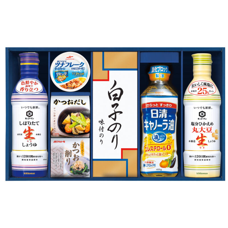 【商品内容】キッコーマン(しぼりたて生しょうゆ・塩分ひかえめ丸大豆生しょうゆ)各450ml・シーラックかつおだし(4g×3)・マルトモかつおパック(0.7g×3)・マルハニチロ油そのままライトツナリセッタ70g・白子のり味のり(3切5枚)・日清キャノーラ油400g