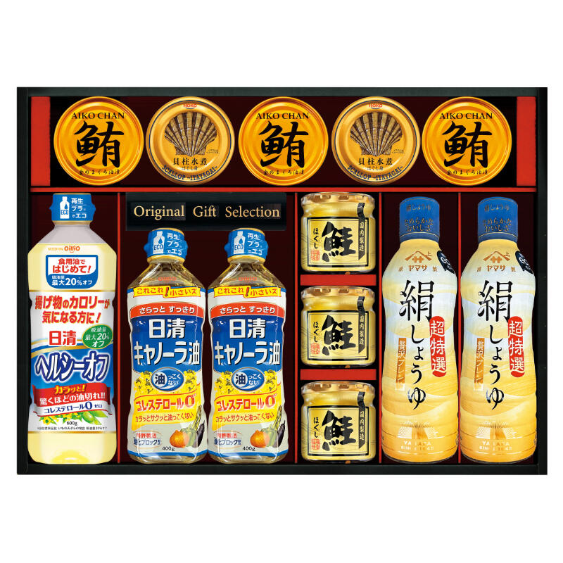【商品内容】ヤマサ絹しょうゆ450ml×2・まぐろ油漬け70g×3・鮭ほぐし50g×3・日清キャノーラ油400g×2・日清ヘルシーオフ600g・宝幸貝柱水煮ほぐし身65g×2