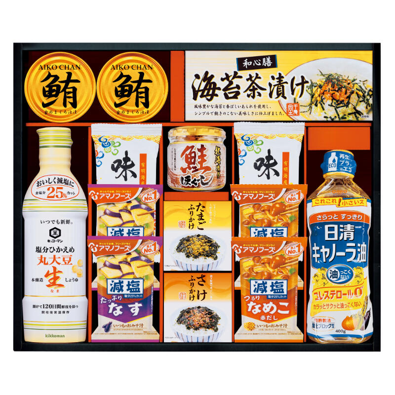 【商品内容】キッコーマン塩分ひかえめ丸大豆生しょうゆ450ml・日清キャノーラ油400g・アマノフーズ減塩いつものおみそ汁(なす・なめこ)各2・有明海産味のり(8切5枚)×2・丸美屋ふりかけ(たまご・さけ)2.5g×各3・鮭ほぐし50g・まぐろ油漬け70g×2・海苔茶漬け(6g×5)