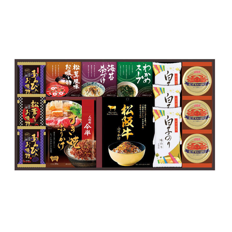 【商品内容】人形町今半すき焼きふりかけ30g・松阪牛ふりかけ30g・紅ずわいがにほぐし身55g×3・丸美屋のり茶漬け(6g×2袋)・永谷園松茸風味お吸い物(2.3g×2袋)・わかめスープ(3.5g×3袋)・お吸い物(あわび入×2・松茸入り)・白子のり味のり(8切5枚)×3