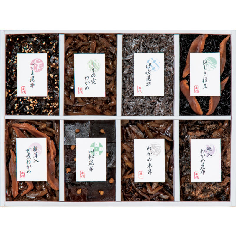 【商品内容】ごま昆布45g・しその実わかめ45g・汐吹昆布20g・山椒昆布45g・ひじき椎茸45g・椎茸入甘煮わかめ45g・鰹入わかめ昆布50g・わかめ木耳50g