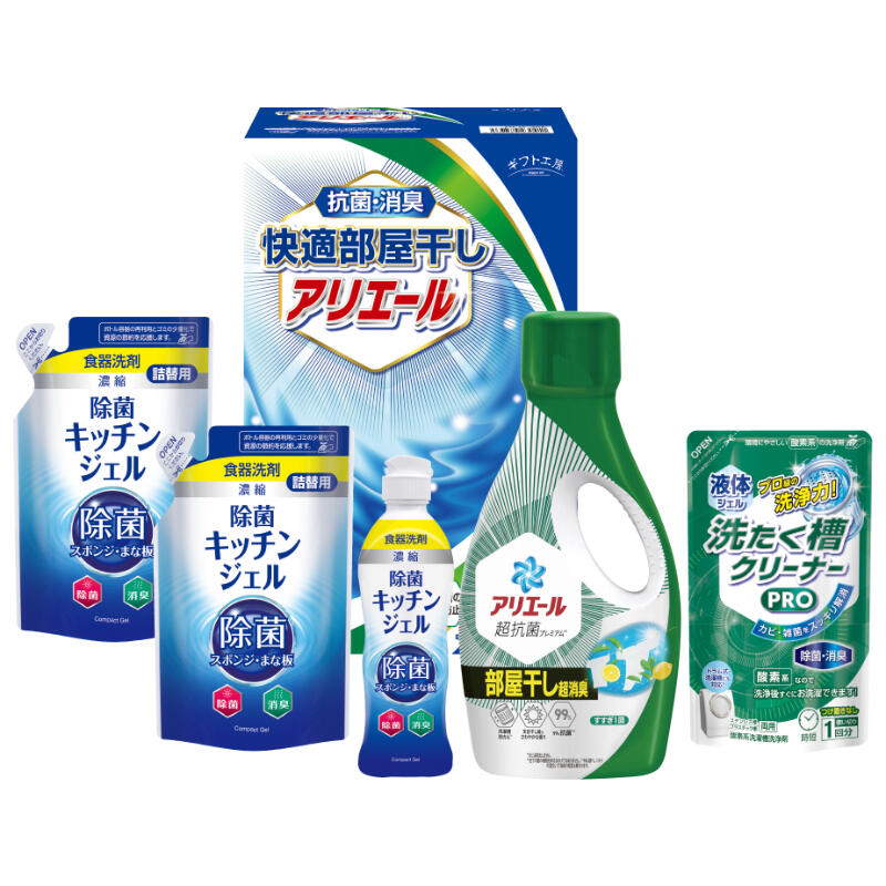 生乾き臭・カビ臭にWで効く部屋干し用のアリエールジェルと本格消臭の抗菌部屋干しソフター、食器洗剤除菌キッチンジェルが入ったクリーンギフトです。