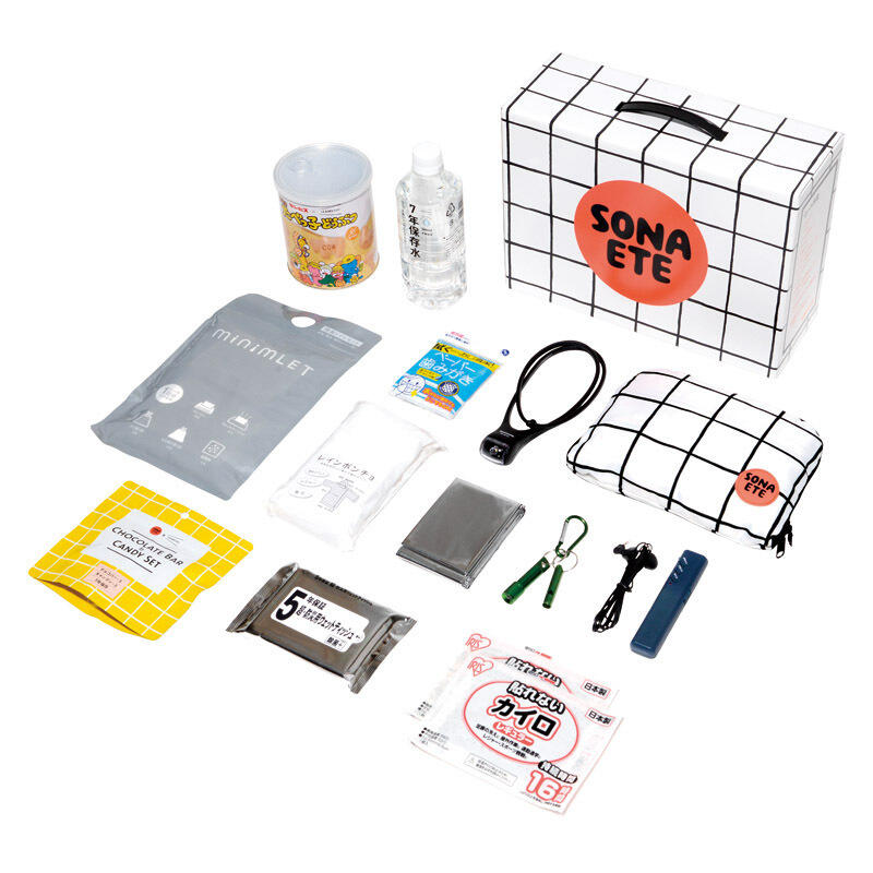 【セット内容】LEDネックライト・FMポケットラジオ・アルミ防寒シート・レインポンチョ・簡易トイレセット・LEDライト付きホイッスル・ペーパー歯みがき(5包)・ウェットティッシュ・カイロ(2枚)・イザメシ7年保存水(500ml)・ギンビス×イザメシ厚焼きたべっ子どうぶつ・SONAETEオリジナルお菓子セット・SONAETE折り畳みリュック×各1