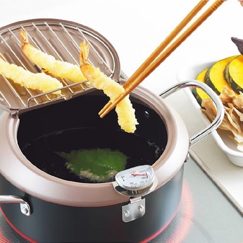 深型設計で油ハネを抑えます。フタ裏がバットになっており機能面を重視。温度計付で揚げ頃チェックが容易です。本体は油の温度が下がりにくく揚げ物をしやすい鉄製!フタは保管の際のホコリやムシよけになります。フタを開ければ素早く油切りができるバットに!斜めに設計されているため、油が鍋に戻ります。IH電磁調理器対応!