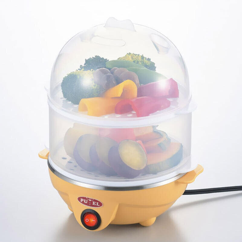 ゆで卵と蒸し料理が調理できる電気蒸し器!ゆでたまごが一度に7個作れます。半熟玉子、完熟玉子もお手のもの!「半熟・やわらかめ・かため」水の量を調節することでゆで加減が選べます。二段同時の調理で時短メニュー!蒸し料理やお料理の下ごしらえなどが一度にできるので1品プラスに一役買います。
