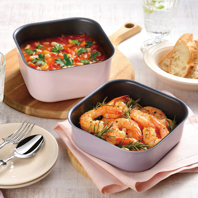 調理も収納もコンパクトにできる。ハンドルが取れる四角いおなべ。