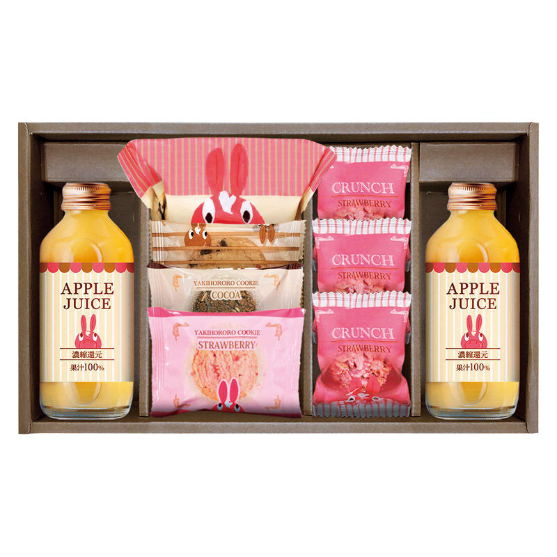 チョコクランチや焼きドーナツ、ざっくり食感のクッキーにアップルジュースをセット。