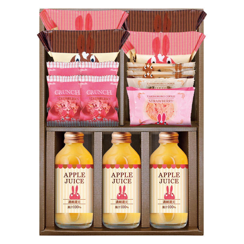 【セット内容】チョコクランチ(ストロベリー)×4、アップルジュース(180ml)×3、焼きドーナツ(ストロベリー・チョコ)・ナッツとチョコのざっくりクッキー×各2、焼きほろろクッキー(ココア・ストロベリー)×各1