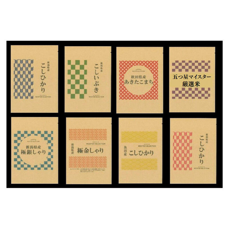 【セット内容】新潟県産コシヒカリ(300g)×4、新潟県産こしいぶき・秋田県産あきたこまち・五ツ星マイスター厳選米・魚沼産コシヒカリ(各300g)×各1