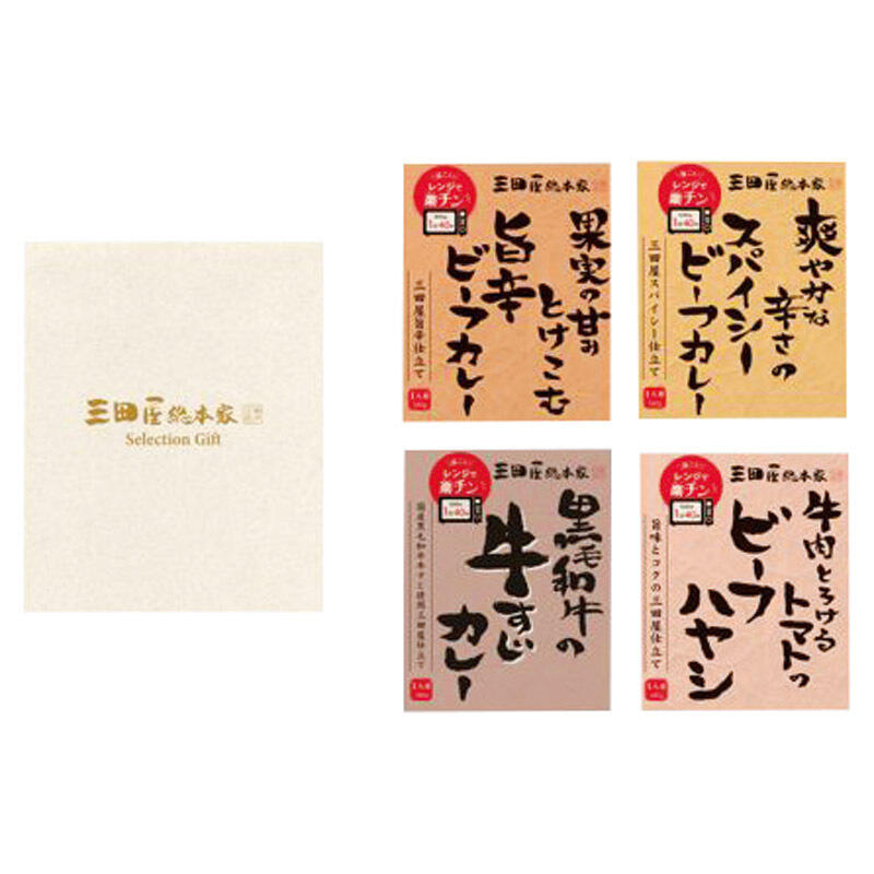 数種類の果実の甘みを引き出した、後から押し寄せる香辛料の辛さが特徴の旨辛ビーフカレーと、複数の香辛料が香るすっきりとした爽やかな辛さが特徴のスパイシービーフカレー、ソースに溶け出した肉の旨味とトマトの酸味のハーモニーが特徴のこだわりビーフハヤシ、国産黒毛和牛の牛すじの食感が楽しめる本格的な味わいの牛すじカレーの4種類を味わえるギフトセット。レンジ対応商品なのでお手軽にお楽しみいただけるセレクションギフトです。