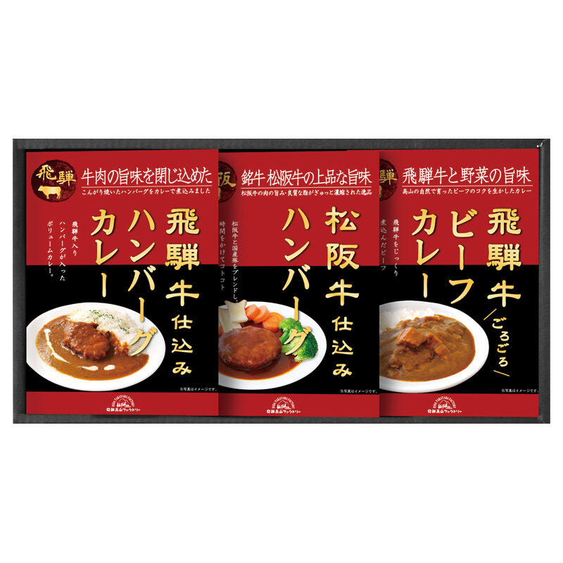 【セット内容】飛騨牛ビーフカレー・飛騨牛入ハンバーグカレー(各190g)・松阪牛仕込みハンバーグ(150g)×各1
