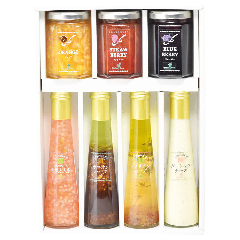 【セット内容】ジャム(オレンジ・ストロベリー・ブルーベリー)(各145g)・ドレッシング(ノンオイル大根と人参・オニオンハーブ・イタリアンハーブ・ガーリックチーズ)(各122ml)×各1