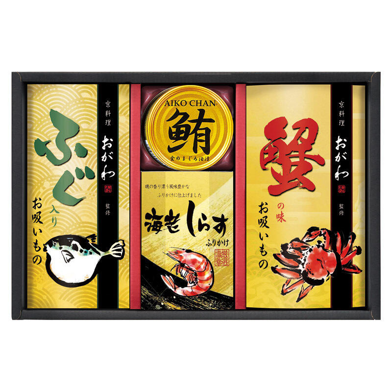 【セット内容】蟹の味お吸いもの(3.8g)・ふぐ入りお吸いもの(3.2g)・ 海老しらすふりかけ(3g)×各3、鮪油漬フレーク(70g)×1