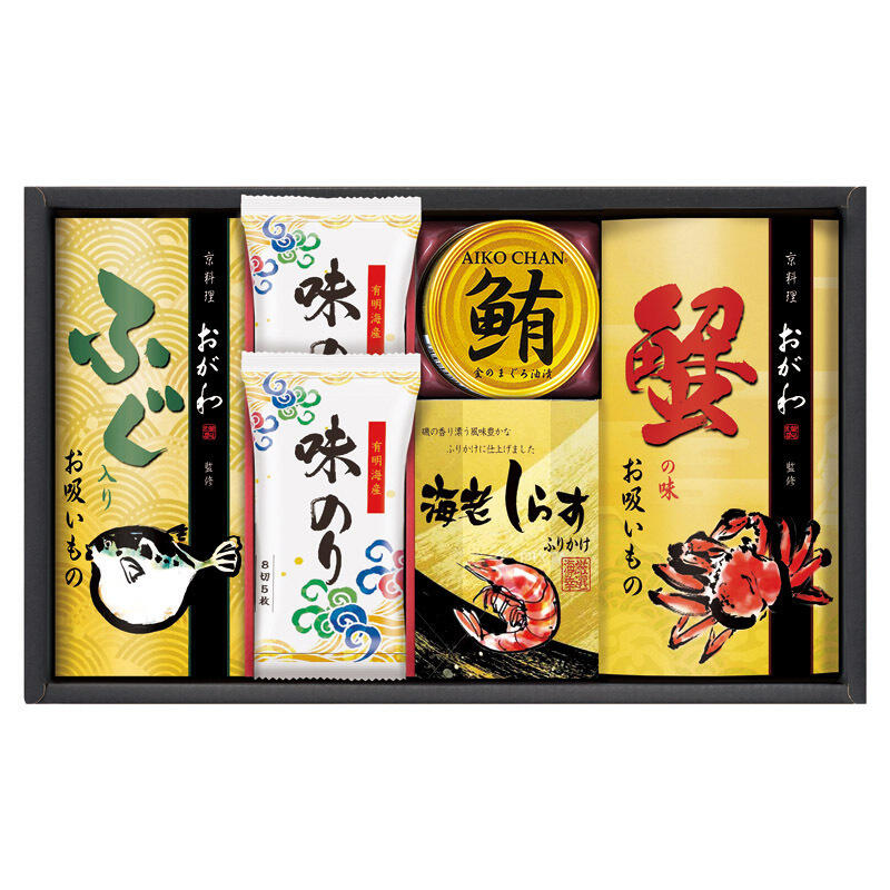 【セット内容】蟹の味お吸いもの(3.8g)・ふぐ入りお吸いもの(3.2g)・海老しらすふりかけ(3g)×各3、有明海産味のり(8切5枚)×2、鮪油漬フレーク(70g) ×1