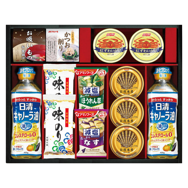 【セット内容】宝幸貝柱水煮ほぐし身65g(固形量35g)×3、日清キャノーラ油400g・有明海産味のり(8切5枚)・ニッスイ紅ずわいがにほぐし身55g×各2、アマノフーズ減塩いつものおみそ汁なす9.0g・アマノフーズ減塩いつものおみそ汁ほうれん草6.8g・マルトモかつおパック(0.7g×3)・永谷園お吸いもの(2.3g×2)×各1