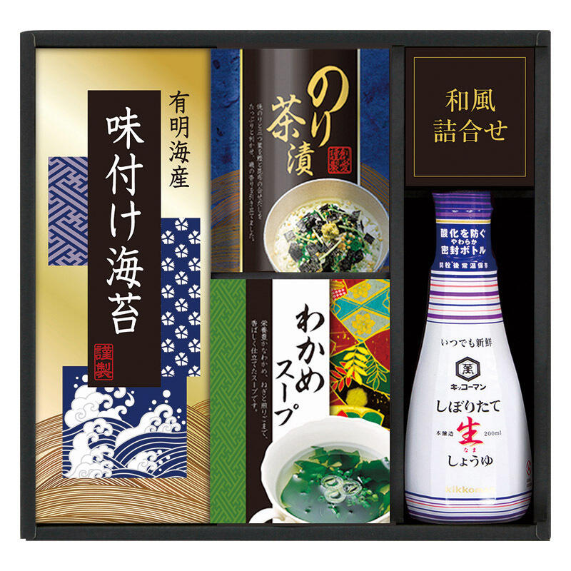 【セット内容】有明海産味付海苔(3切4枚)・のり茶漬け(4.3g×2袋)・わかめスープ(5.3g×2袋)・キッコーマンしぼりたて生しょうゆ(200ml)×各1