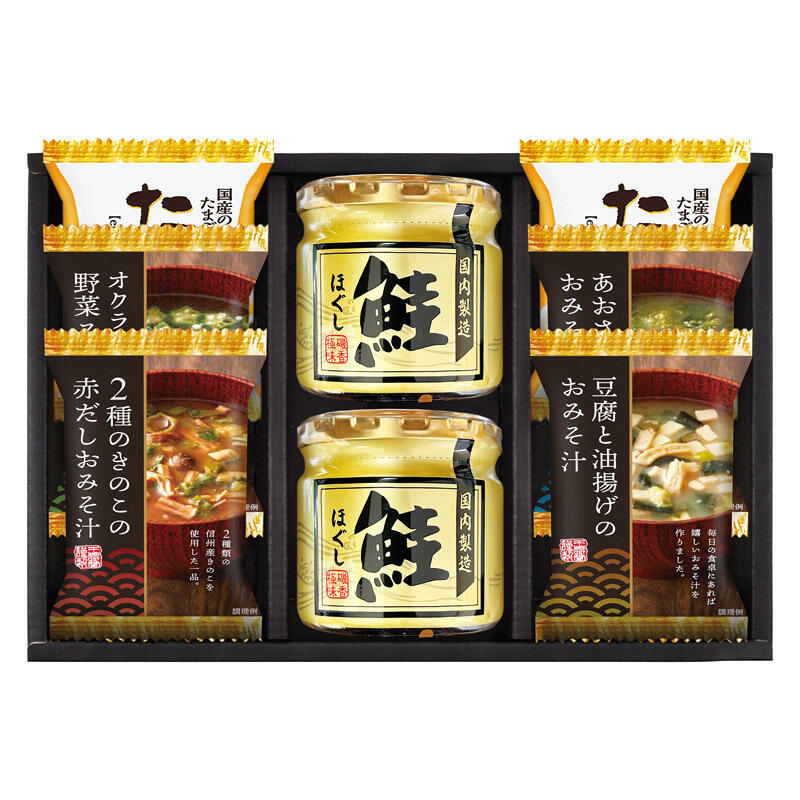 【セット内容】たまごスープ(6.4g)・鮭ほぐし(50g)×各2、とうふと油揚げのおみそ汁・2種のきのこの赤だしおみそ汁・あおさとわかめのおみそ汁・オクラ入ねばねば野菜スープ×各1