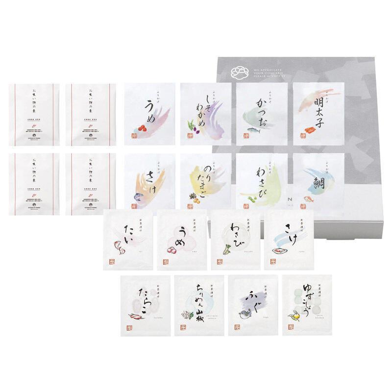 【セット内容】お吸い物の素×4、贅沢茶漬け(たい・うめ・わさび・さけ・たらこ・ちりめん山椒・ふぐ・ゆずこしょう)・ふりかけ(うめ・しそわかめ・かつお・明太子・さけ・のりたまご・わさび・鯛)×各1