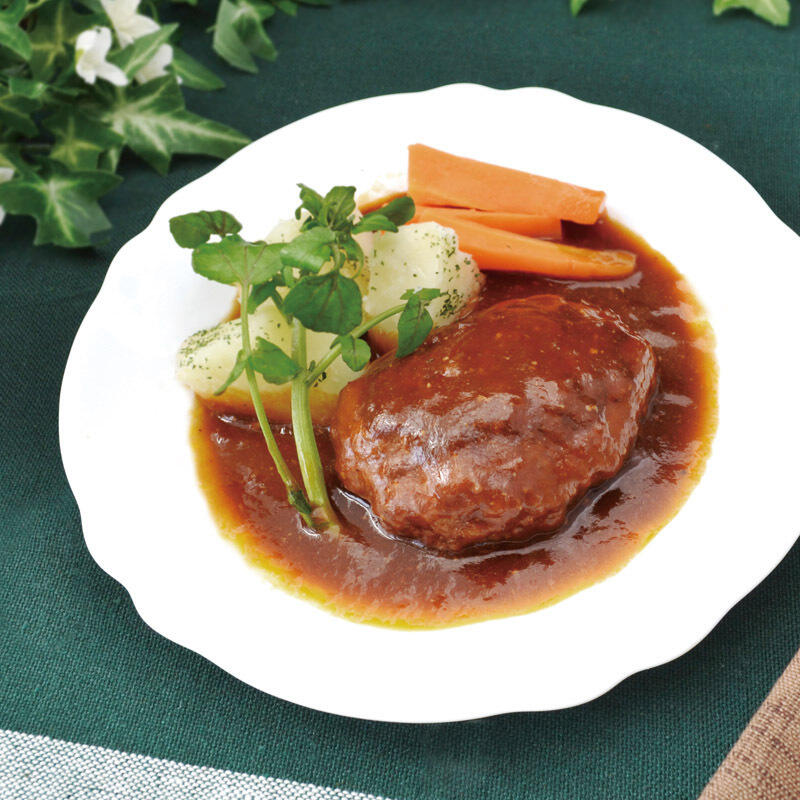 銘牛の松阪牛と近江牛を使用した煮込みハンバーグは、レトルトパックで簡単調理でいただけます。それぞれの肉の旨みを最大限にいかし、大豆ミートを入れることによって、ヘルシー志向に仕上げました。フライパンで温める焼きハンバーグと、飛騨牛のレトルトカレーも詰め合わせました。