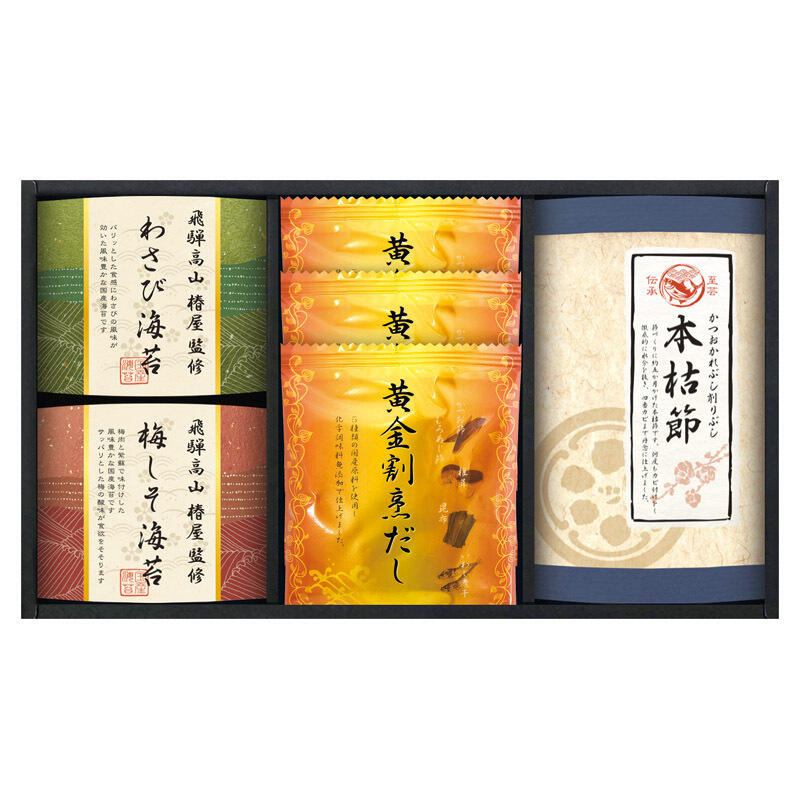 【セット内容】黄金割烹だしパック(8g)・本枯れ鰹節(2g)×各3、飛騨高山椿屋監修わさび海苔・飛騨高山椿屋監修梅しそ海苔(各8切6枚)×各1