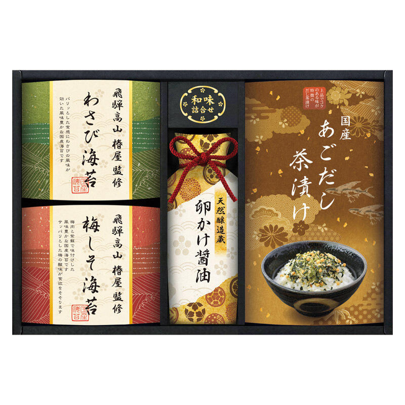 【セット内容】国産あごだし茶漬け(5g)×3、飛騨高山椿屋監修わさび海苔・飛騨高山椿屋監修梅しそ海苔(各8切6枚)・天然醸造蔵仕込み卵かけ醤油(200ml)×各1