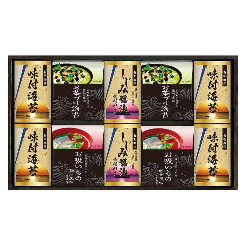 【セット内容】有明海産味付海苔(10切20枚)×4、永谷園お茶づけ海苔(4.7g×5袋)・永谷園お吸いもの松茸風味(2.3g×6袋)・しじみ醤油味付海苔(10切20枚)×各2