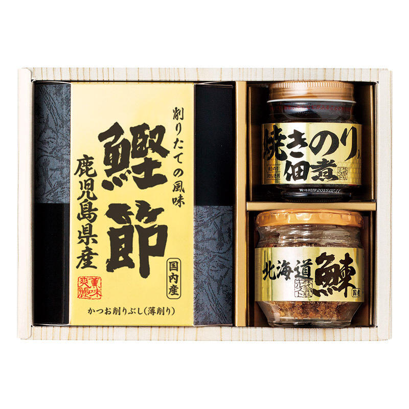 【セット内容】焼きのり入佃煮(85g)・北海道産鰊フレーク(50g)・鹿児島県産鰹節(2g×3)×各1