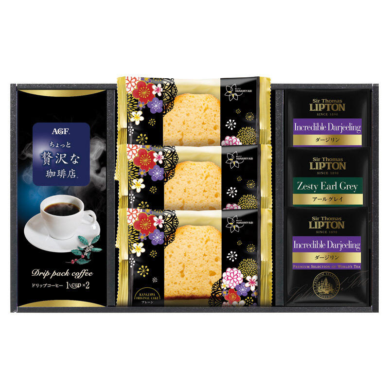 【セット内容】金澤兼六製菓オリジナルケーキ(プレーン)×3、サー・トーマス・リプトン ダージリンティーバッグ(2.2g)×2、AGF ちょっと贅沢な珈琲店スペシャルブレンド(7g×2袋)・サー・トーマス・リプトン アールグレイティーバッグ(2.1g)×各1