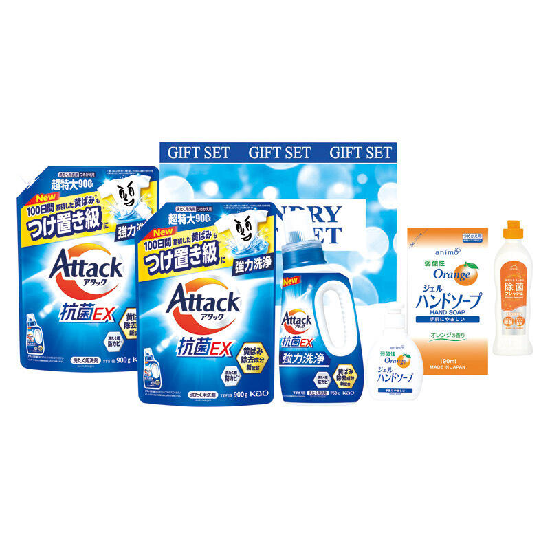 【セット内容】アタック抗菌EX超特大(詰替)(900g)×2、アタック抗菌EX(750g)・台所洗剤除菌フレッシュ(240g)・弱酸性ジェルハンドソープ(200ml)・弱酸性ジェルハンドソープ(詰替)(190ml)×各1
