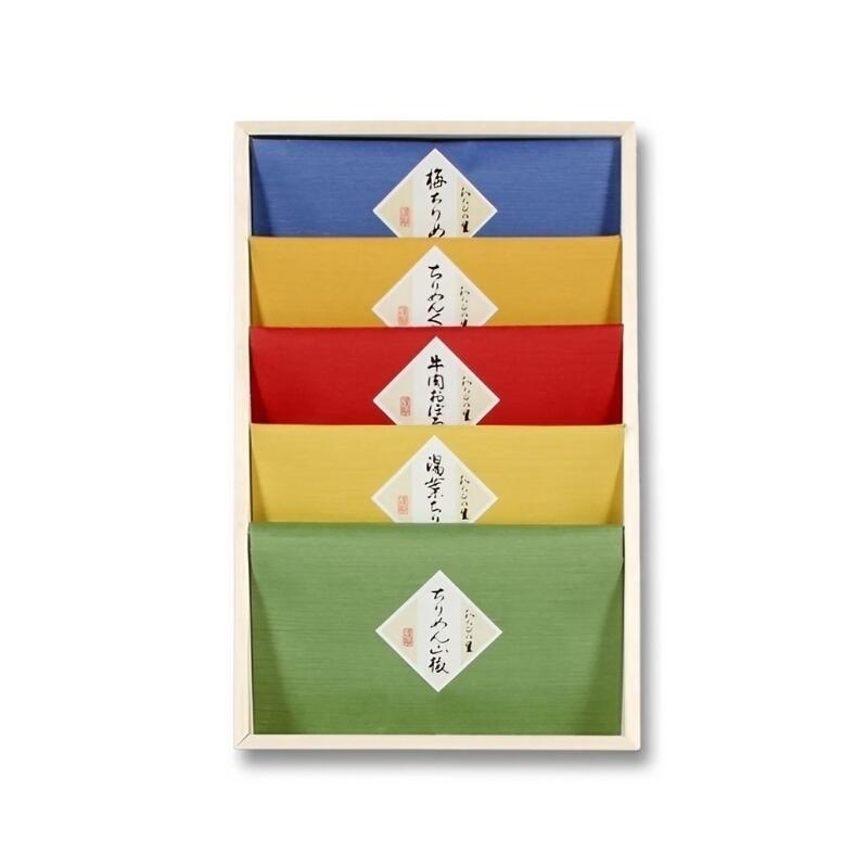 ちりめん山椒、牛肉おぼろ煮、梅ちりめん、湯葉ちりめん、ちりめんくぎ煮を収めた、木箱入りで高級感のあるセットです。