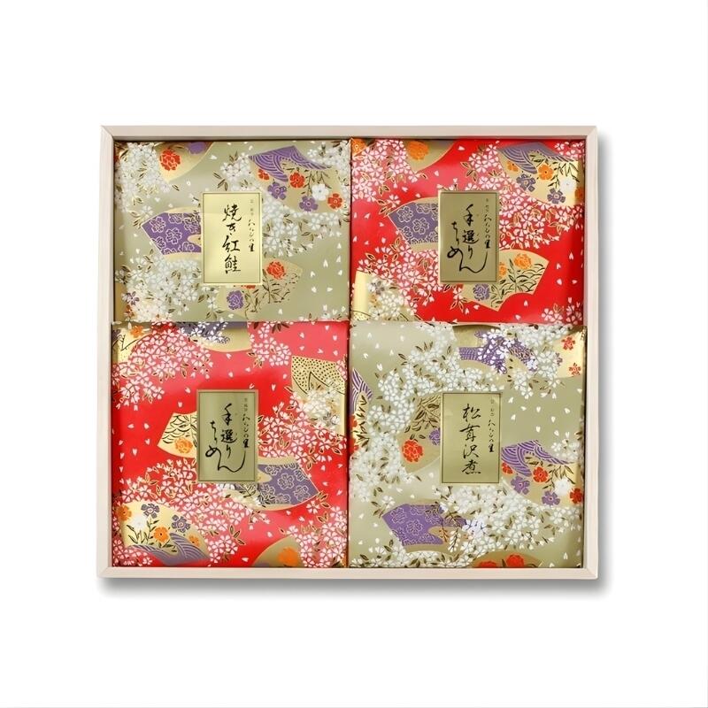 国産のちりめんじゃこと香り高い実山椒を炊き合わせた手選りちりめん、松茸沢煮、焼き紅鮭の三種詰め合わせです。